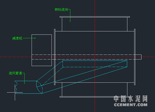 方案三:在鎖風(fēng)閥徑向位置安裝導(dǎo)風(fēng)管,無需再引出管路通到磨機(jī)。通方案二將窯尾熱風(fēng)通入鎖風(fēng)閥徑向?qū)эL(fēng)管中,由此來解決粘料問題。后經(jīng)過驗(yàn)證,這種方法起到了很好的效果,不論是成本,還是空間結(jié)構(gòu),以及施工等方面都是最節(jié)儉的。(如圖二)